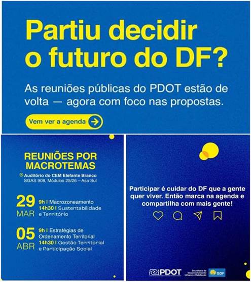Os encontros acontecerão no auditório do Centro de Ensino Médio Elefante Branco (SGAS 908, Módulos 25/26, Área Especial, Asa Sul), nos dias 29 de março e 5 de abril, divididos em quatro grandes temas do Plano Diretor: