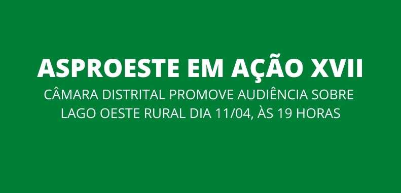 Na pauta, a realização de uma audiência pública da Câmara Distrital, com a participação da Asproeste e de todos os órgãos envolvidos nos processos de licenciamento ambiental e regularização fundiária do Lago Oeste, que foram iniciados em 2005 e permanecem travados em algumas áreas dos órgãos públicos federais e distritais.